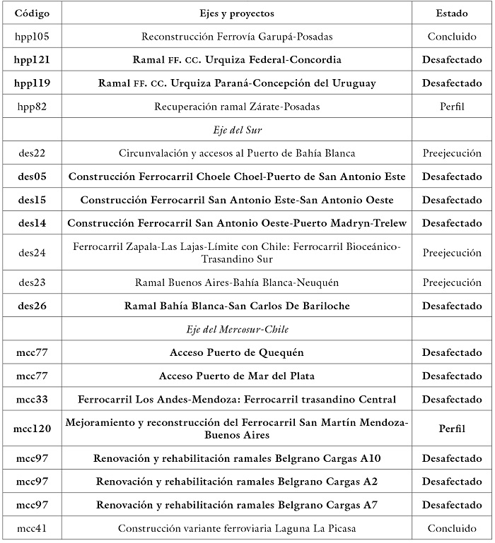 En lo que respecta a la cartera de proyectos de IIRSA presentada para el 2011, se encontraba compuesta de 531 proyectos, siendo 135 correspondientes al subsector ferroviario, atravesando total o parcialmente el territorio argentino 37 de estos (tabla 2). El eje que presenta mayor cantidad de proyectos ferroviarios es el Capricornio, con 13 propuestas (sobre los rieles del Belgrano Cargas) y 11 correspondientes al Eje de la Hidrovía Paraná-Paraguay (sobre las vías de los ferrocarriles Mitre y Urquiza), donde la estrategia perseguida es la rehabilitación de los ramales cerealeros para acceder a los puertos (Schweitzer, 2014).
