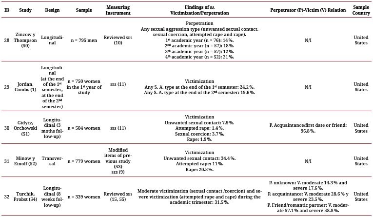This is the first proposal developed in Latin America concerning studies conducted with samples of Latin America and other regions, whose objective was to systematically review and synthetize the findings of the studies on prevalence of sexual aggression —perpetration and victimization— in undergraduate students of both genders, from the beginning of their university life on, in the last ten years (2008-2018).