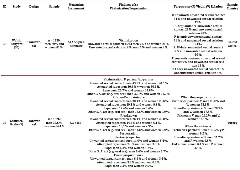 22.9 % (n = 8) of the studies reported figures on victimization and/or perpetration in general, not specifying subtype nor seriousness of the event. The remaining studies (n = 27) reported that the most frequent aggression type is the unwanted sexual contact, both in persons who have been aggression victims and in those who have perpetrated the aggression. Regarding the relation perpetrator-victim, 48.6 % (n = 17) of the studies concluded that the most frequent perpetrator was the one who was within the most immediate sphere of the victim, being this a friend, partner or acquaintance; the other studies did not report this information (n = 18).