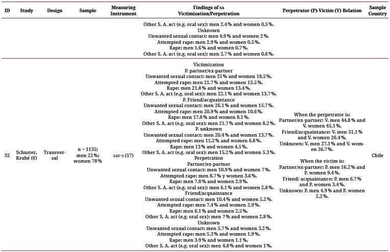 Prevalence of victimization and of perpetration of the sexual aggression identified in the studies ranged between 0.4 %-85 % and 0.6 %-46.2 %, respectively, these reports varied according to the subtype of sexual aggression and to the victim’s/perpetrator’s gender (table 1).